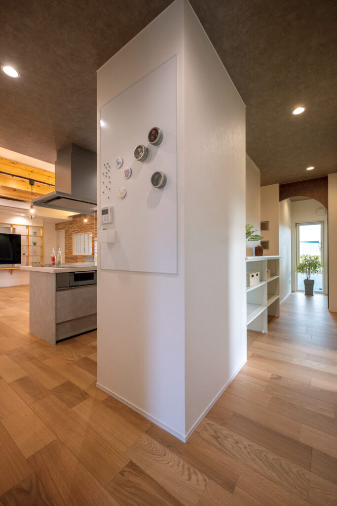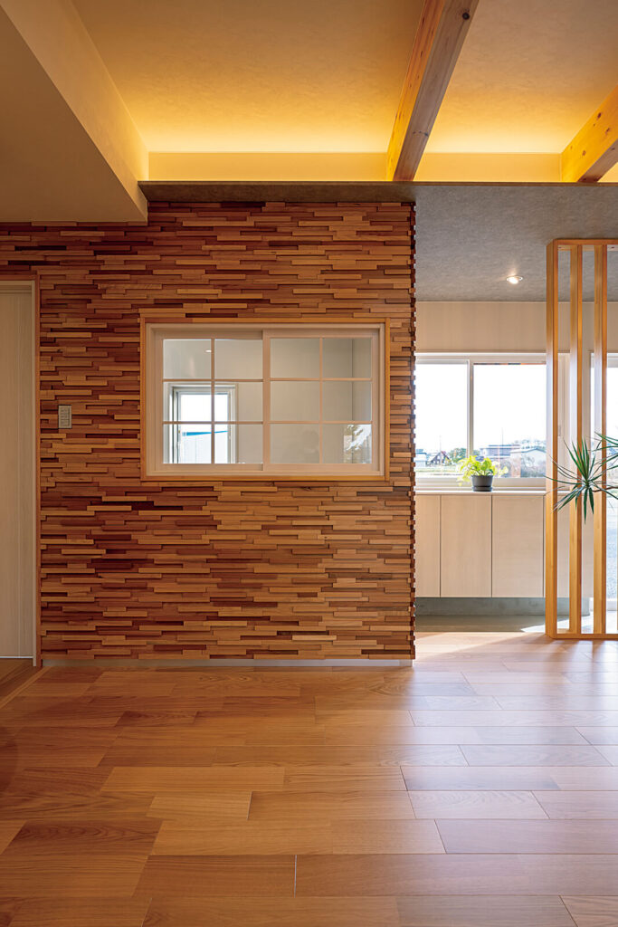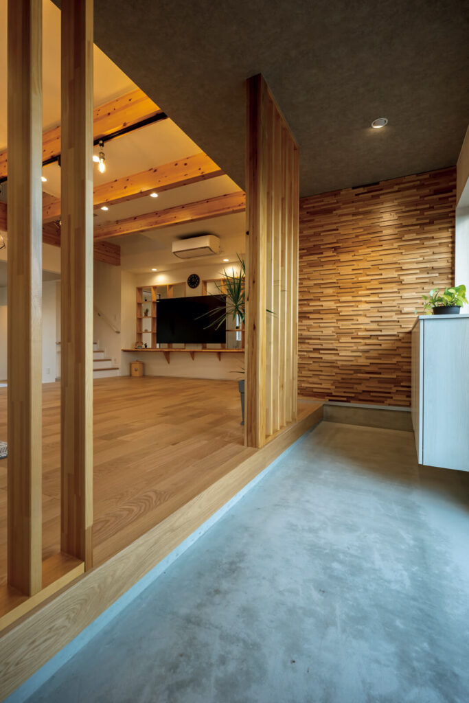 土間とリビングの間に設えられた壁のアトリエ風ウッドパネルが特徴的