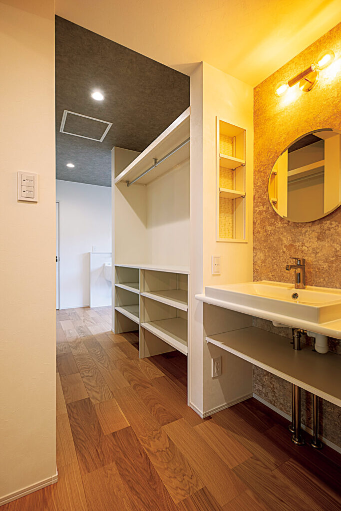 洗面台周りの収納は最小限。各個室にもクローゼットは設けていないため、家族の服は洗面台脇のファミリークローゼットにすべて集約