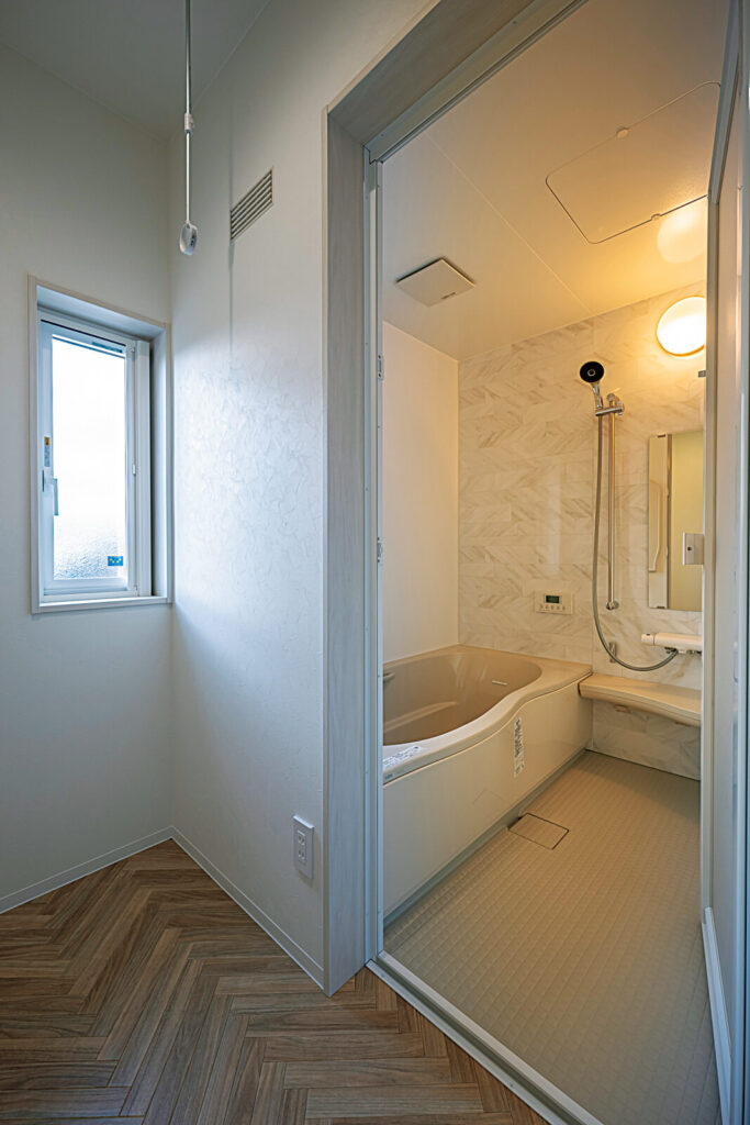 家族が入浴中でも洗濯ができるよう、バスルームの手前には独立型の脱衣室を完備