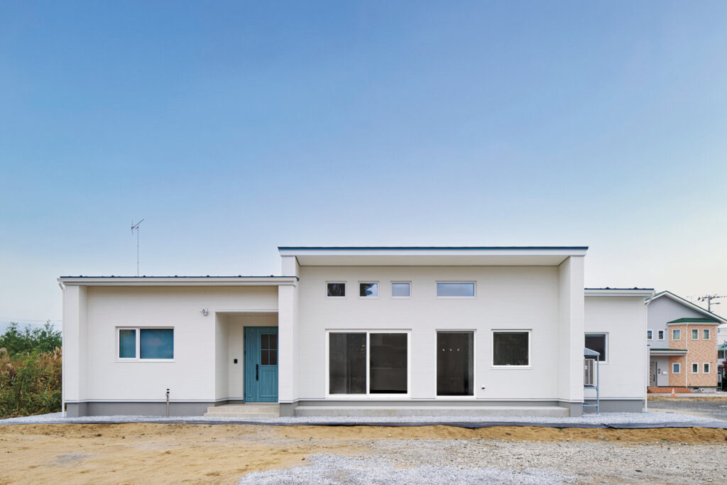 完成した住まいは南面に大きな開口がある平屋。以前の賃貸も平屋で、無駄がないフラットな動線が気に入っていたそう。間仕切りの少ない開放的な間取りとUᴀ値0.21、C値0.30の高い住宅性能というご夫妻の希望も備えています。