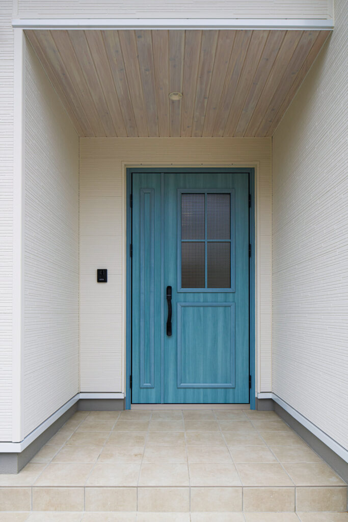 ご夫妻お気に入りのブルーの玄関ドア。両開きで大きな荷物も運びやすい。約1.4mの奥行きがあるポーチは風除室としての役割を持つ
