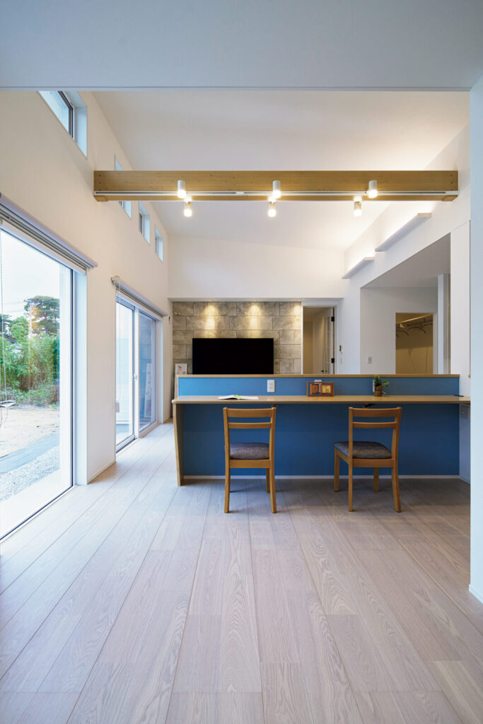 全体的に白とグレージュでまとめ、青をフォーカルポイントとして使用したデザイン。シンプルで爽やかな印象が、開放的な空間とマッチしている