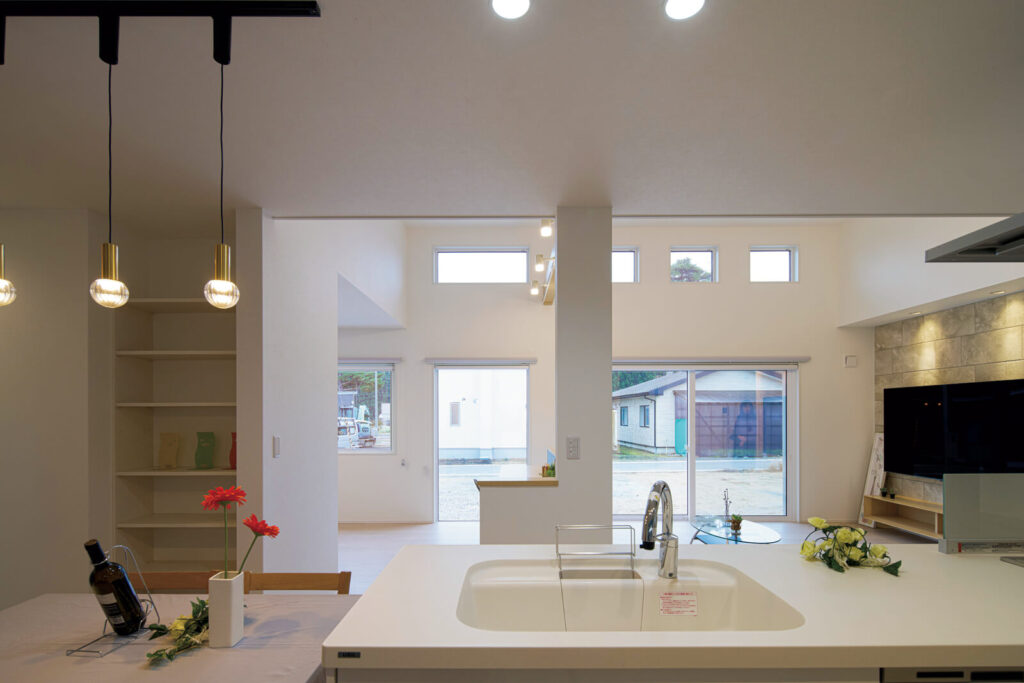 約30帖のLDK+多目的スペース。なだらかな勾配天井のハイサイドライトを付けることで、明るく開放的な空間を実現した。スノーホワイトのフローリングは木目が浮き出していて、滑りにくくなっている