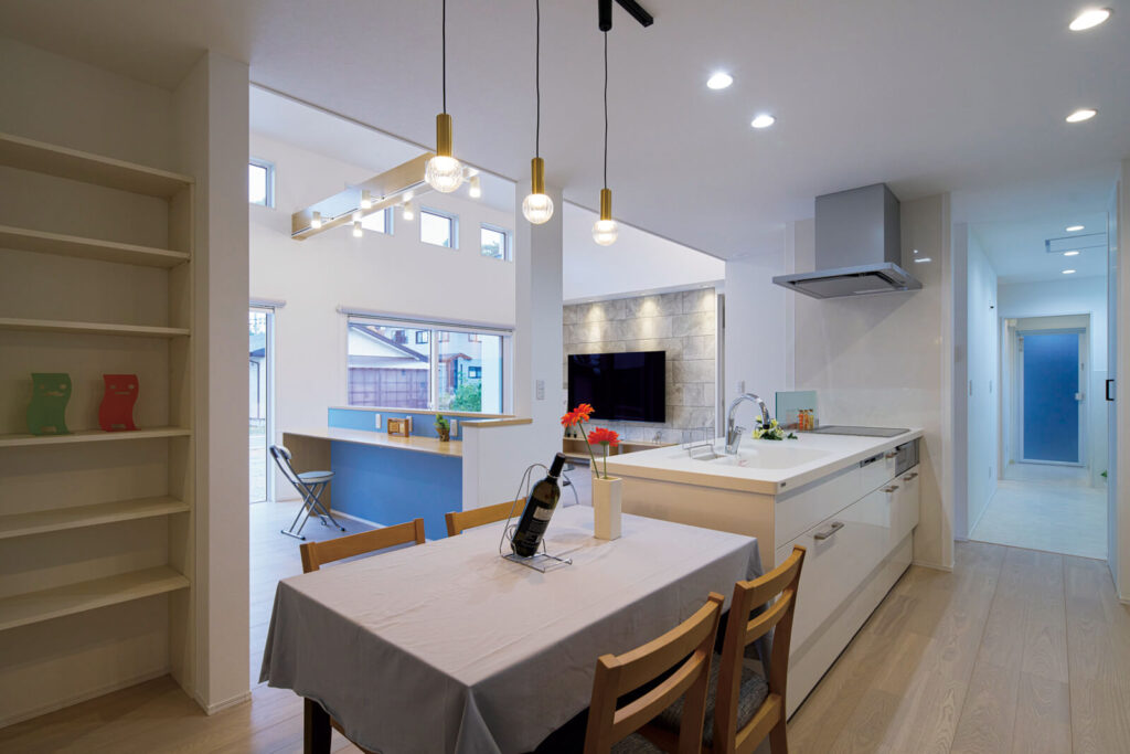 団らんの場であるリビングまわりは、家族が集まりやすい工夫が詰め込まれています。隣にある多目的スペースはくつろいだり遊んだりするだけでなく、造作カウンターで勉強や仕事もできます。キッチンからは家中が一望できるようにし、水まわりへのアクセスを最短に。家族とのコミュニケーションや家事もスムーズに行えます。収納はあまり多くせず、あえて中が見えるようにすることで、住まいをきれいに保てるようにしました。