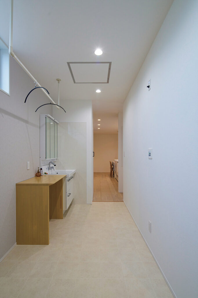 広々としたユーティリティは約2mの幅があるので、洗濯物を干しても移動の邪魔にならない。ファミリークローゼットが隣接していて収納も簡単