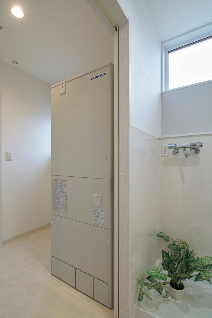 脱衣室は独立させ、引き戸を付けてプライバシーに配慮した。この脱衣室にエコキュートを格納