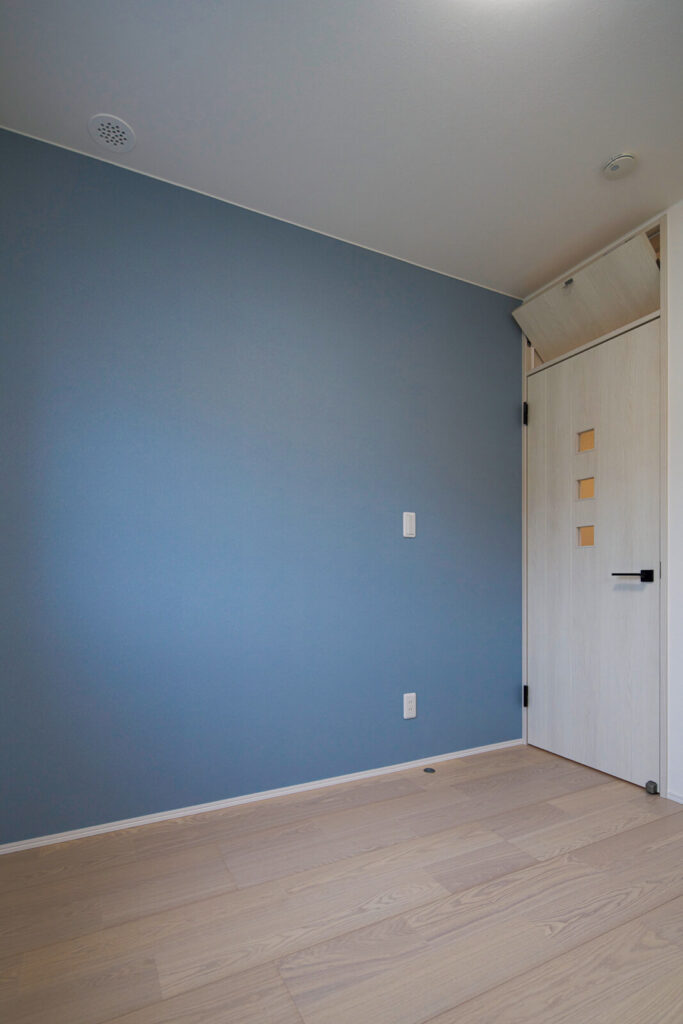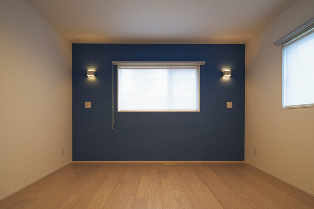 約7帖のご夫妻の寝室は、ネイビーの壁紙で落ち着ける雰囲気に仕上げた