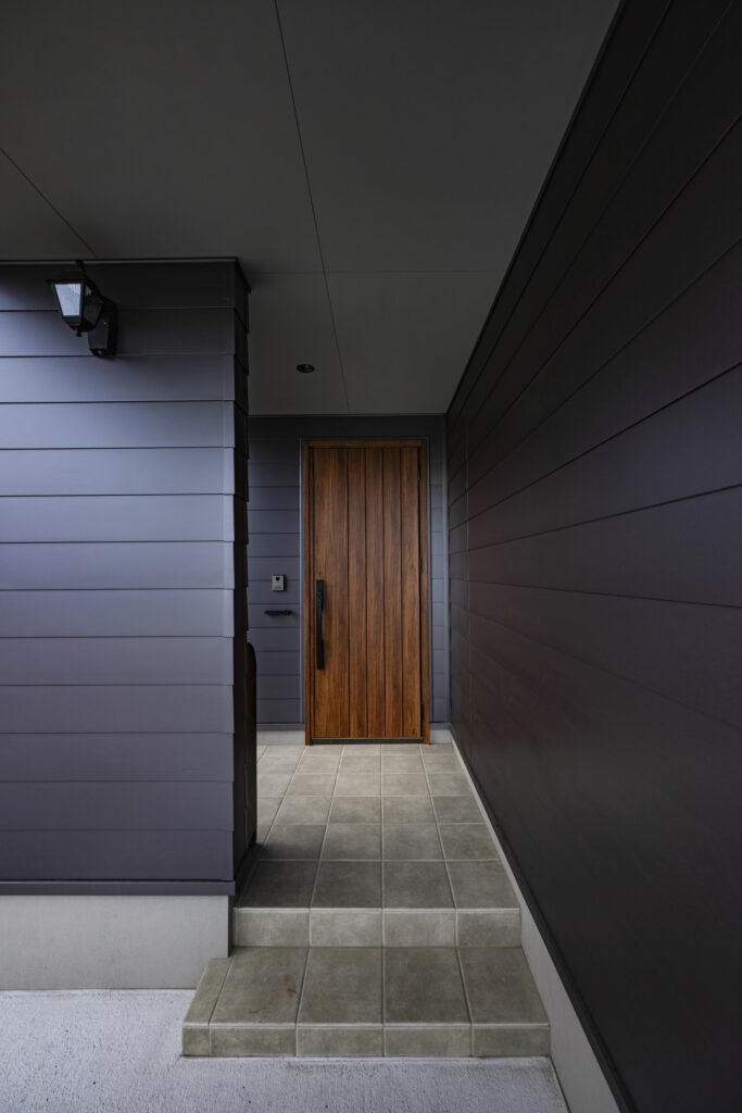 玄関ポーチは全体に屋根がかかっているので、雨や雪の日でも鍵を開けるまでの間に濡れる心配がない。地面と同じ高さになっている手前のスペースは自転車置き場で、ここにも屋根がかかっている