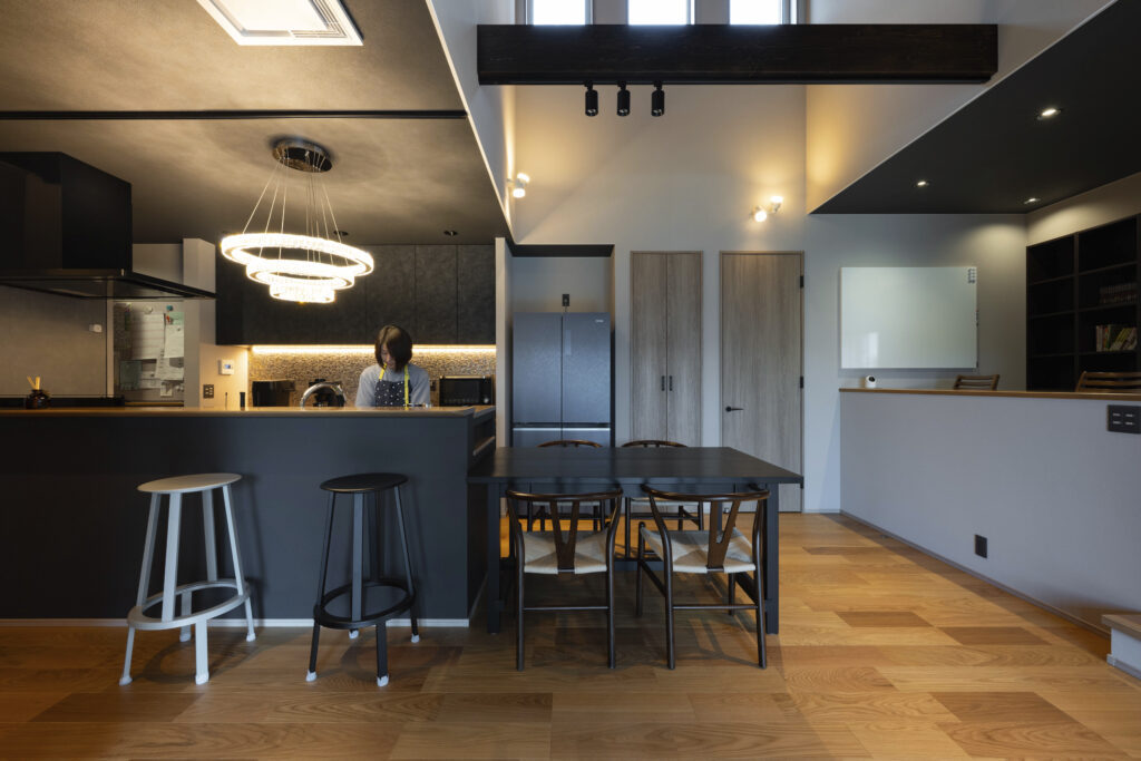 約20帖の開放感あふれるLDK。キッチンを中心に、ダイニング、リビング、玄関がつながっていて、帰宅した家族は必ずキッチンを通る動線になっている。キッチンにはカウンターを備え、ダイニングテーブルをすぐ隣に設置したことで、家族が集まりやすい空間に