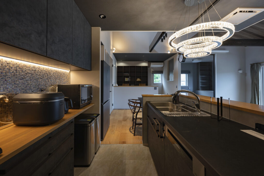 キッチンと背面収納の間は約1m。大人が余裕を持ってすれ違える広さでありながら、一歩踏み出せばあらゆる道具に手が届く絶妙な距離。家電はあらかじめ置くものを決め、寸法に合わせて置き場所を設計した