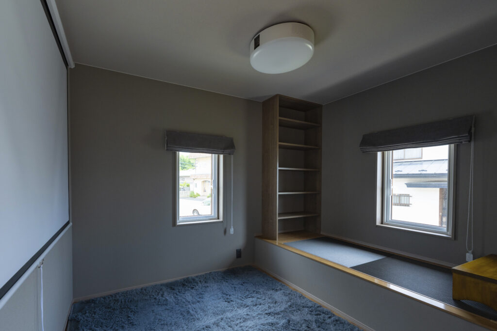 普段はシアタールーム、来客時は客間として機能する小上がり。小上がりの中に、もう一段つくられた小上がりは、ヌックや椅子、ベッドの役割を果たす。すりガラスの引き戸を閉めれば個室としても使える