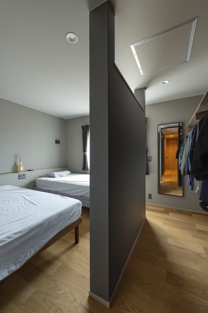 ウォークインクローゼットを備えたご夫妻の寝室は約7帖。壁を中心にした行き止まりのない間取りで、空間を無駄なく使用しつつ広く見せている